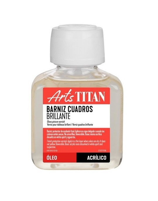 Barniz protector de acabado final. Aplicar en capa delgada cuando los colores estén totalmente secos. No amarillea. Reversible. Base: resina acrílica disuelta en white spirit y aguarrás. Para aplicarlo, remover bien el envase. Como barniz final, aplicar diluido y en capa delgada, sobre los colores totalmente secos. No debe mezclarse con aceites ni colores al óleo; no debe usarse como médium. Este barniz es reversible, si se desea puede eliminarse fácilmente frotando suavemente con un trapo blando impregnado con Esencia de Petróleo.